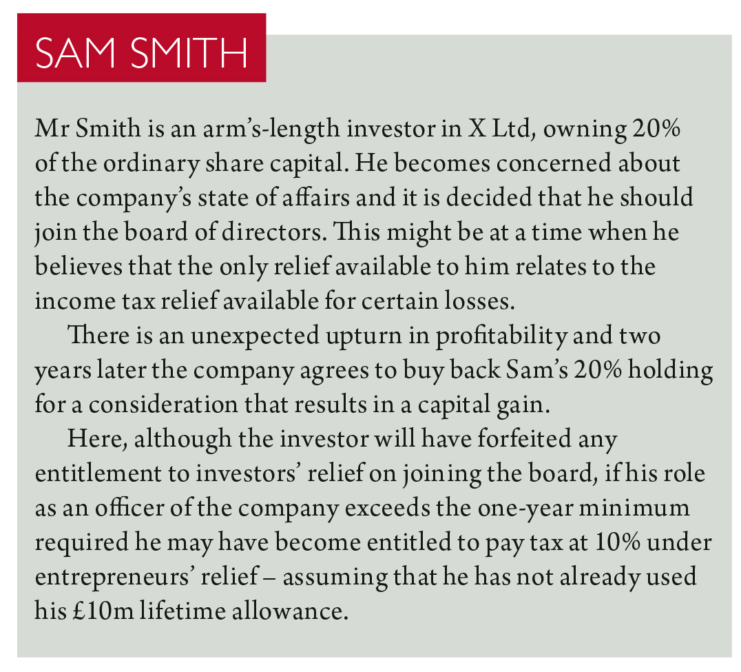 A single investor can therefore enjoy £10m of gains taxed at the 10% entrepreneurs’ relief rate and £10m under the 10% investors’ relief rate. Although in his March Budget speech the chancellor referred to the extension of entrepreneurs’ relief in this regard, the legislative position is that investors’ relief is a new and quite separate and distinct measure.