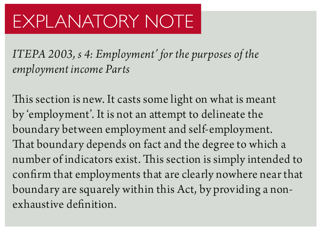Section 4 goes on to state that the terms ‘employed’, ‘employee’ and ‘employer’ have corresponding meanings. It should be noted, however, that this is not an exhaustive definition – and may cause problems in some situations. The Treasury published an Explanatory Note on the interpretation of the then new ITEPA 2003, s 4.