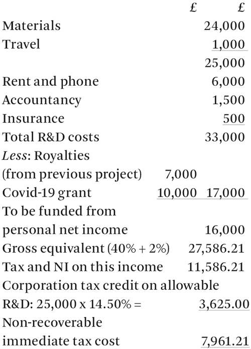 I believe he will be able to claim the 14.5% R&D tax credit in the company, but this still leaves him with a large unrecoverable tax cost and the relief is much less than the 130% deduction would allow. Ultimately, in five to ten years, he is hoping that the royalty income will mop up all the tax losses, but he has an immediate funding problem. This will be even worse next year without the Covid-19 grant.